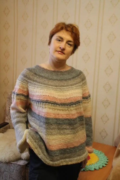 Техника вязания - круглая кокетка сверху, без швов. Просто вязать лицевой гладью мне было скучно, поэтому добавляла и простую резинку, и полоски изнанки по лицевой, и накид плюс две вместе, и немного путанки. Вобщем, развлекалась как могла :)))) Сначала сразу после платочки на горловине вывязывала классический росток, рядов 6 он у меня, для таких ниточек вполне достаточно. Затем в 7-м ряду - первые прибавки. И далее также в каждом 7-м. Первая линия прибавок - через 2, потом через 3, потом через 4 и т.д. петли. Итого у меня кажется 7 линий прибавок, просто уже немножко подзабыла. После того, как меня устроил размер кокетки в длину и ширину, отложила петли рукавов, добавила конечно же подрезы. Тушку продолжила вязать, немного убавляя симметрично по бокам, где-то до талии, а потом чуть прибавила. Рукава немного убавила, примерно на количество петель подреза. По тушке я немножко подбирала ниточки, чтобы секции шли ровно одна за другой. А уже на рукавах - что осталось из ниток, так что они у меня снова не одинаковые по цвету. Но мне так даже больше нравится, веселее :)))