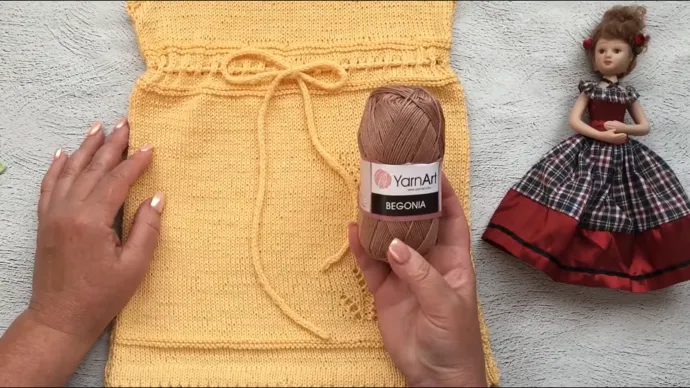 Сарафан связан на спицах 2,5 мм; пряжа YarnArt “Begonia” ушло 2 мотка. Низ сарафана двойной с зубчиками, по подолу сбоку ажурная веточка.