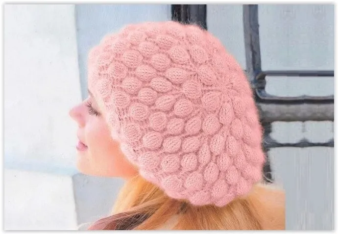 Этот элегантный берет, связанный крючком узором с шишечками, смотрится очень изысканно и мило. Он не сложен в исполнении, поэтому можно смело пробовать связать его самим.