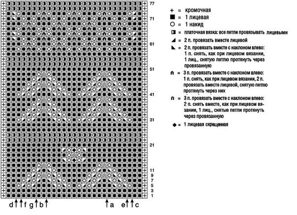Одновременно во 2-м р. от планки прибавить с обеих сторон по 1 п. = 49 (53) 59 п. и петли распределить следующим образом: 1 кром., 5 п. между стрелками с и а, раппорт повторить 3 раза, закончить 6 п. между стрелками b и d, 1 кром. (начать с 8 п. до стрелки а, раппорт повторить 3 раза, закончить 9 п. после стрелки b), 1 кром., 4 п. между стрелками е и а, раппорт повторить 4 раза, 2 п. между стрелками b и g, 1 кром. Для скосов в каждом 12-м р. от планки прибавить с обеих сторон 8 х 1 п. (в каждом 10-м р. 4 х 1 п. и в каждом 12-м р. 5 х 1 п.) в каждом 10-м р. 10 х 1 п. = 65 (71) 79 п. Прибавленные петли включать в узор, при этом проследить за тем, чтобы на внешних раппортах число провязанных вместе петель и накидов было постоянно одинаковым, в противном случае петли до следующей прибавки вязать лицевой гладью.