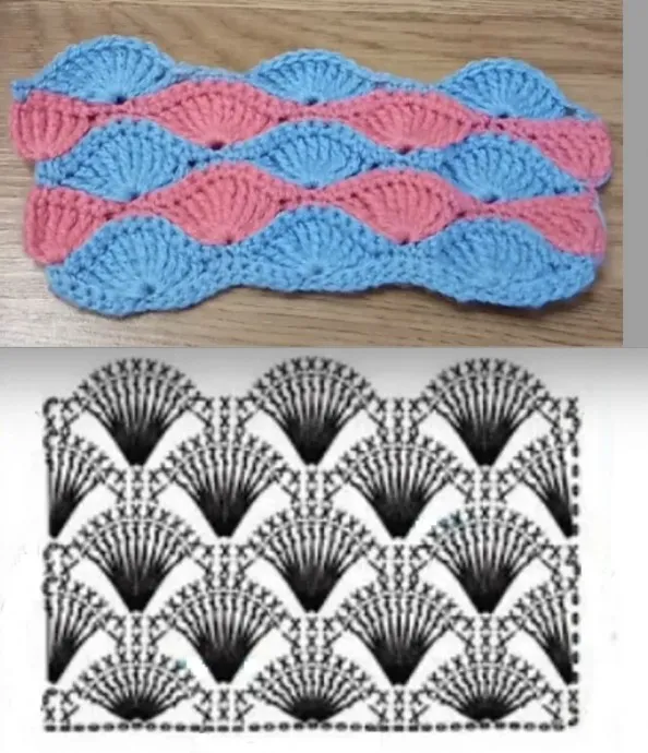 И ещё, на схеме веерочки состоят либо из СС2Н, или из СС3Н, видно не очень чётко, но по 5 петлям подъема в одном из рядов, полагаю что всё-таки столбики здесь с 3 накидами.
