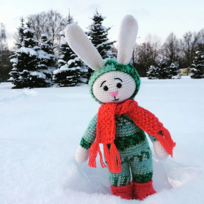 Зайка вышел на прогулку и мороз ему не страшен!! Кто ж составит компанию ему???? Связан из пряжи Ализе шерсть/акрил и не замерзнет в лесу! Цена 1500 руб.