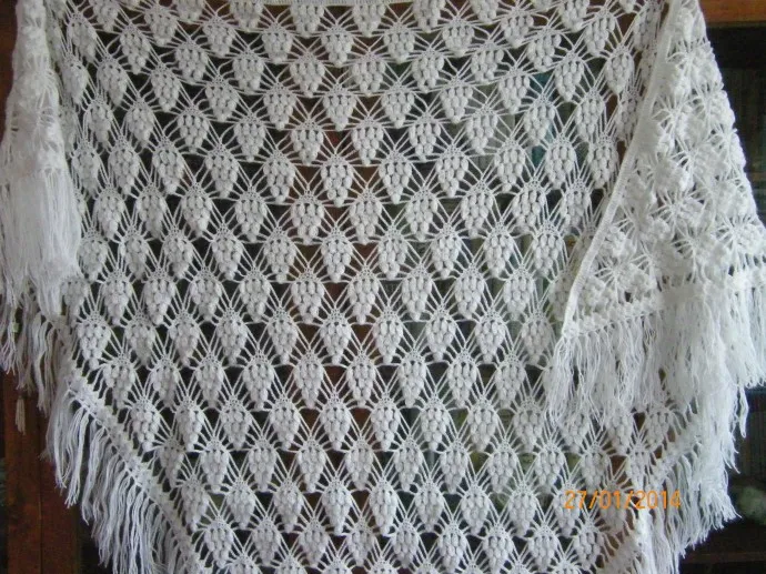 Эту шаль я вязала в 2014 году. Настроение было и связала за три дня. В тот период что-то вязала шали очень много и разным рисунком. Вязала шаль "Виноградная лоза" из белой ангорки. Сколько ниток ушло моточков 2 или 3- не помню. Крючок № 1.5. Очень мягкая, легкая и нежная.