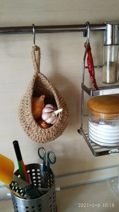 Вязаная капелька из джута для чеснока и лука, хорошо вписалась на кухне, все под рукой.