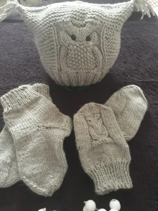 Комплект для ребенка 6-12 масяцев с рисунком "сова"( шапочка, носочки, варежки). Связан из пряжи YaraArt baby.Эта пряжа отлично подходит для маленьких детей(мягкая, гипоалергенная). размер шапочки на окружность головы 44-46. Есть в продаже.