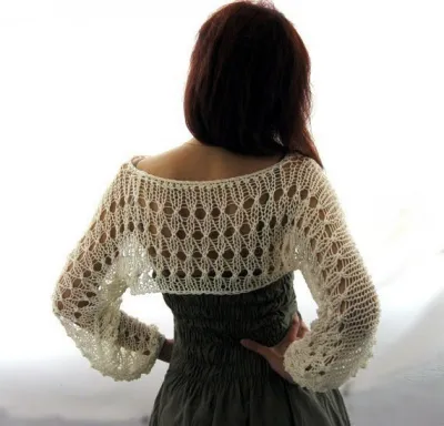 Автор Рюмина: Вяжется из высокого качества акриловой пряжи. Мягкий, лёгкий и уютный. И ваш летний наряд будет более элегантным и романтичным. Это практично и удобно. Спицы № 5. Узор такой: первые четыре ряда все петли лицевые. (Можно сделать 2 ряда, как вы захотите). 5 ряд: *2 лиц. петли вместе, накид (его можно сделать и двойным, пробуйте)* и так повторить до конца ряда. Снова 4 лиц. ряда и 5-ый ряд повторяем. Вяжем снизу вверх цельным полотном. В конце сшиваем швы рукавов — сверху петелька в петельку и снизу.