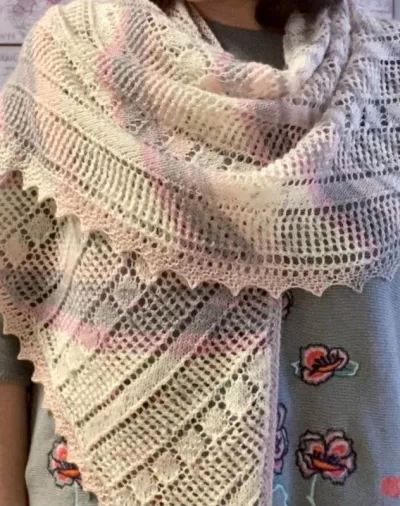 Шаль под названием «Треугольная», дизайн Елены Готлиб, привлекла меня своим оригинальным дизайном и необычным способом вязания из центра. Никогда не вязала из центра спицами по методу вязания салфеток и скатертей, решила попробовать. Правда ошиблась с пряжей, нужна однотонная, секционка ложится как ей вздумается. Но тем не менее шаль получилась интересная, большая, нежная и тёплая, пряжа 75% шерсти и 25 нейлон.