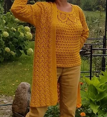 Добрый день. В вашей команде я новичок, Выставляю одну из своих работ. Кардиган и топ связанный крючком из пряжи Alize Diva silky effect