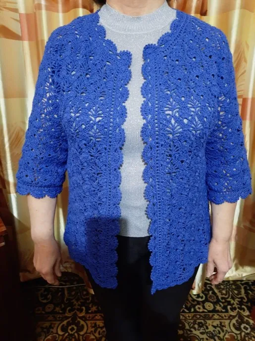 Ажурный жакет вязаный крючком "Синие тюльпаны"