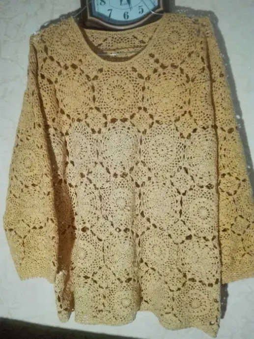 Ажурный пуловер из моих долговязов связан крючками №2, №1.5, №1 из бобинного хлопка абрикосового и жёлтого цвета(в 100 граммах 1600 метров) в 2 нити и с 1 нитью люрекса персикового цвета. Цвет в двух тонах: кокетка и рукава чуть темнее, от низа до кокетки светлее. На фото это видно. Ширина пуловера 52 см, длина 70 см. Длина рукава 57 см, ширина 18 см.