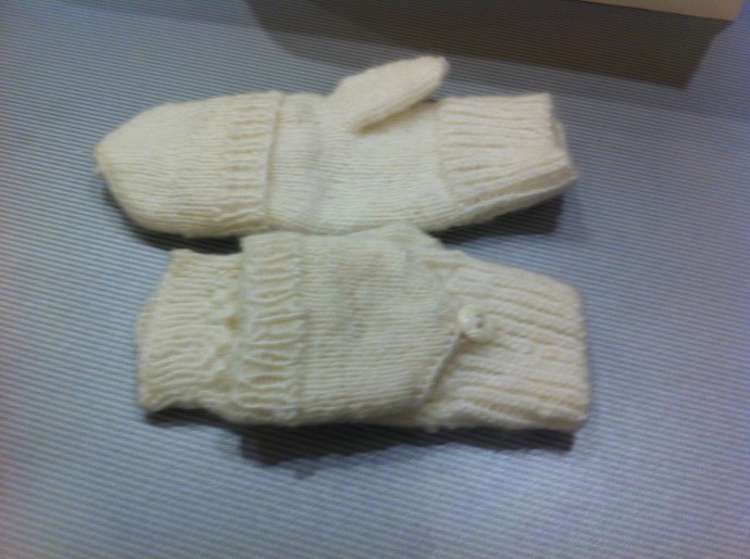 Комплект из белой шапочки, снуда и митенок-варежек из пряжи Ализе Ангора голд в две нитки.