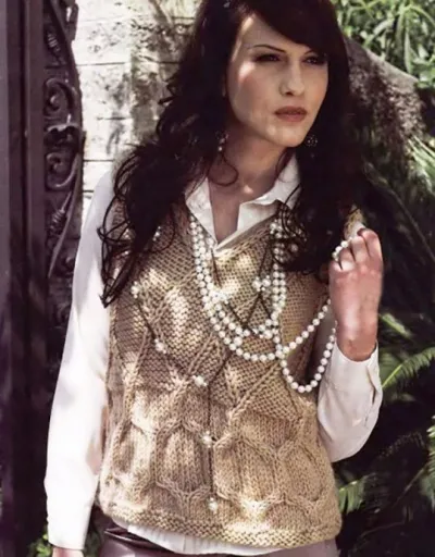 Бежевая безрукавка спицами с крупным узором