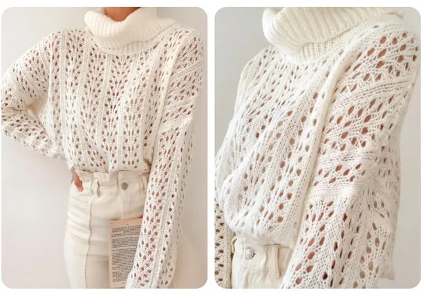 Похожий узор. Разница только в боковых петлях. Сейчас вяжу. Схема не соответствует узору на белом джемпере.