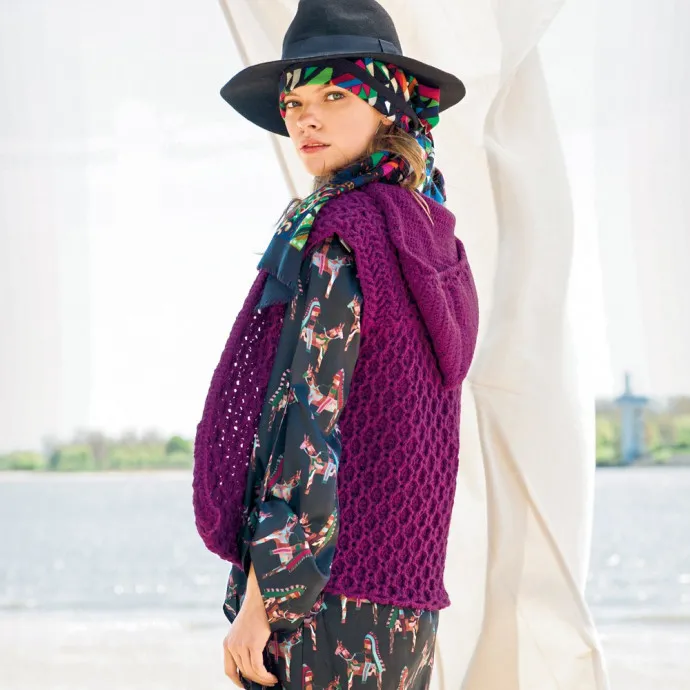 - Пряжа (90% беби альпака, 5% мериносовой шерсти, 5% полиамида; 140 м/50 г) — 500 г фиолетовой;