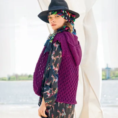 Для капюшона обвязать крючком верхние 5 см скосов V-образного выреза с обеих сторон, а также вырез горловины спинки 1 р. из 65 ст. б/н. Продолжить вязать узором для капюшона. Через 30 см = 28 р. работу закончить. Выполнить верхний шов капюшона. Передний край капюшона обвязать 1-м р. узора «Елочка».