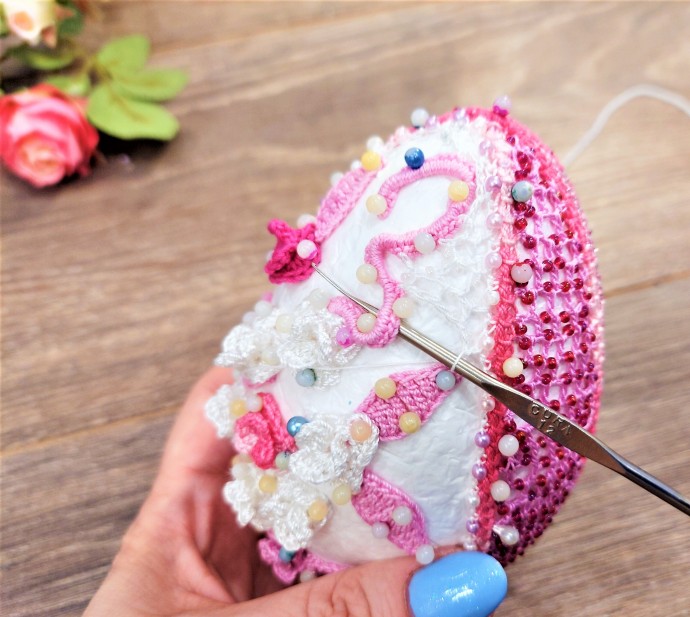 Яйцо оформлено бисером, на центральной части яйца цветочная композиция, на обратной стороне 5 сегментов-полос с бисером и блестящей нитью.