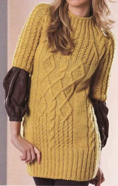 Вам потребуется: 650 (750/850) г тёмно-жёлтой пряжи Schachenmayr select TREND DELUXE (56% шерсти альпака, 40% полиэстера, 4% полиамида, 80 м/50 г); прямые спицы № 6; круговые спицы № 6 длиной 40 см, 60 см и 80 см; 1 вспом. спица.