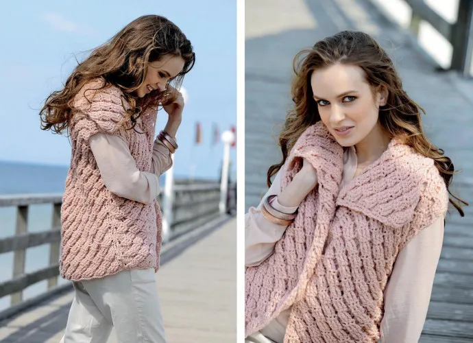 ПРАВАЯ ПОЛОЧКА Выполнить начальную цепочку из 38 (44) в.п. и 2 в.п. подъема, далее вязать плетеным узором. Через 24 (26) р. от начального ряда оставить для плеча по левому рабочему краю непровязанными 18 (24) п. В следующем ряду выполнить для воротника дополнительную цепочку из 18 (24) в.п., далее вязать на всех петлях плетеным узором еще 20 см.