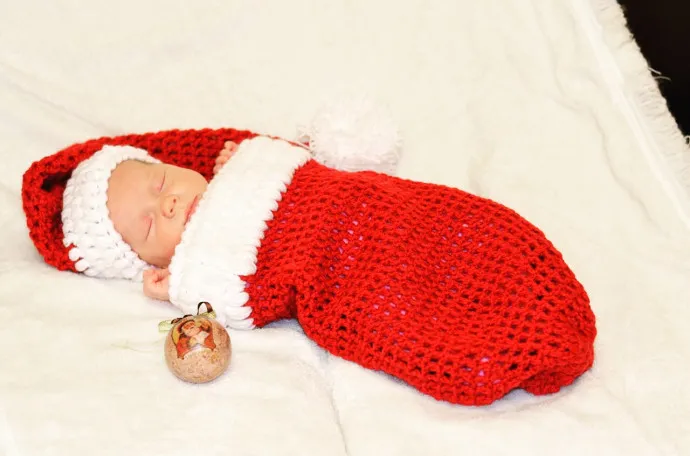 Для первой новогодней фотосессии. Комплект связан из красной мягкой итальянской шерсти, а отделка турецкий бебиакрил.