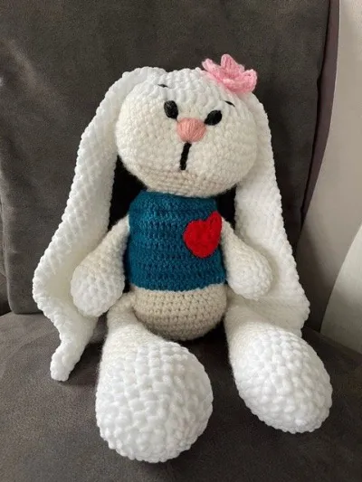 Зайка связана из плюшевой пряжи, описание взято из Интернета, с небольшими моими дополнениями. Рост игрушки 40 cm.