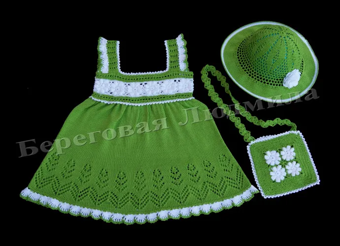 Комплект для девочки связан на машине+крючок. Связан из качественного хлопка . В комплект для девочки входят сарафан, шляпка, сумочка. Можно связать любой комплектации и цвета , по вашему желанию. Зеленый комплект в наличии