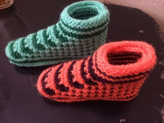 Далее 2 ряда без прибавлений. Потом прибавим еще 2 петли. Подошва 12 петель.Вяжем до середины подошвы по 2 вместе в начале и в конце.Убавляем 2 петли, вяжем до конца, когда останется 5-10-5, убавляем еще 2 петли. Получилось 4-8-4. Собрали на 2 дополнительные спицы 4+8+4. Собрали на 3 спицу все петли по очереди и закрываем по 3 петли вместе.Следочки на любую полноту ноги, полнота зависит от средних петель. Размер от набранных и количества рядовю Количество петель не четное для узора 15-9-15,17-9-17,19-9-19 и т.д