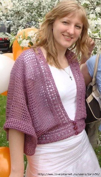 Описание работы: для планки связать цепочку из 16 возд. п. 3 возд. п. подъёма и вязать узором для планки. Через 105 см = 89 р. от наборного края работу закончить. Для пояса связать цепочку из 23 возд. п. 3 возд. п. подъёма и вязать узором для пояса. Через 87 см = 75 р. от наборного края работу закончить. Отметить средние 21 ст. с/н по левому краю планки, присоединить нить к боковой стенке ст. с/н 35-го р. и вязать основным узором, выполняя прибавления. Через 40 см = 30 р. от планки работу закончить. Ст. с/н до 1-й группы из ст. с/н – левая полочка; ст. с/н между 1-й и 2-й группой из ст. с/н – левый рукав; ст. с/н между 2-й и 3-й группой из ст. с/н – спинка; ст. с/н между 3-й и 4-й группой из ст. с/н – правый рукав; ст. с/н после 4-й группы из ст. с/н – правая полочка. Пришить свободный левый край планки с обеих сторон к краям полочек. В конце обвязать правый край планки следующим образом: присоединить нить к последней наборной возд. п. и связать 1 ст. б/н. затем 4 ст. с/н в верхнюю часть ст. с/н 1-го р., 1 ст. б/н в 3-ю возд. п. подъёма 2-го р.,* 4 ст. с/н в верхнюю часть ст. с/н следующего ряда, 1 ст. б/н в 3-ю возд. п. подъёма следующего ряда, повторять от *. Пришить пояс левым краем к нижнему краю следующим образом: пришить первые 12 р. к короткой стороне планки и первым 7 ст. с/н левой полочки, следующие 15 р. края пояса оставить открытыми для левого рукава, следующие 21 р. пояса пришить к средним 27 ст. с/н спинки, следующие 15 р. пояса оставить открытыми для правого рукава, оставшиеся 12 р. пришить к последним 7 ст. с/н правой полочки и короткой стороне планки. Равномерно пришить пуговицы (см. фото).
