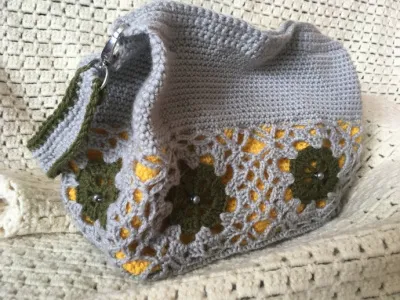 Сумочку вязала из самых простых тоненьких остатков ниток. Боковина сумки двойная, каждое полотно связано за разные края косички от донышка сумки, а затем скреплены по верху.
