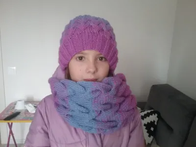 внучке связала снуд и шапочку теневой косой, вязание градиентное в 3 нитки. Также связала снуд и шапочку невестке. И ей еще жилетку.
