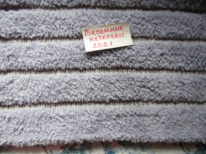 Кофточка теплая на весну,, уже один раз в ней выходила. Теплая, мягкая. От основных пушистых ниток этикетов не осталось. Серая полоса вязалась в 4 нити. Спицы №5.