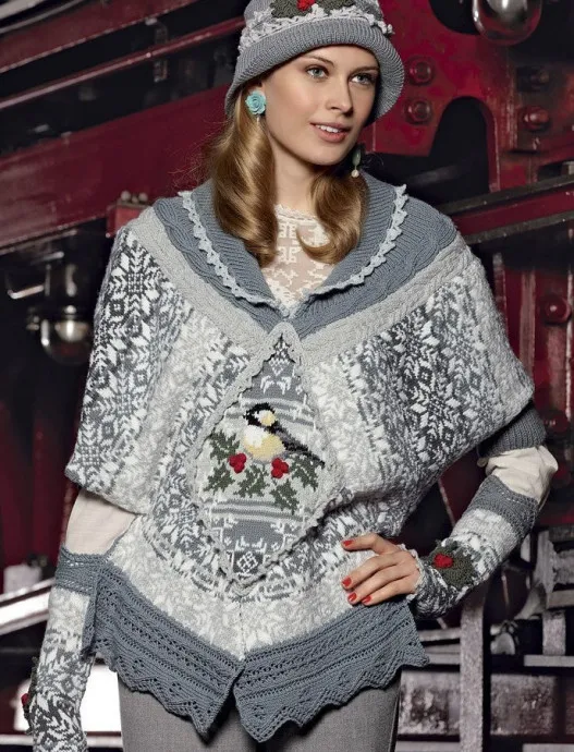 Необычный шарф-пончо, украшенный затейливыми узорами, выглядит волшебно, как из зимней сказки.