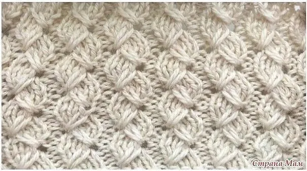 9 ряд - (лиц. сторона) кром., 1 изн., *2 лиц., затем спицу вводим на 4 ряда ниже рядом с изн.петлей,провязываем вытянутую петлю, одеваем её на левую спицу и провязываем вместе с 1 лиц. петлёй *изн., кром.