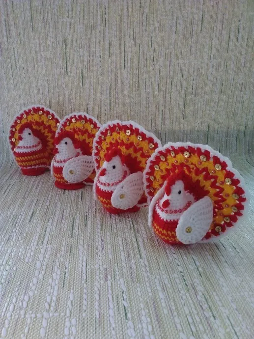 Эти милые курочки - подставки для яиц связаны по мастер-классу, который нашла на youtube, на канале Hobby-MK. Решила довязать к ним крылышки, с ними как-то интереснее получились.