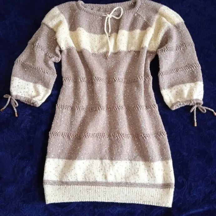 Туника, размер 48-50. Пряжа Alize Abiye примерно 370-400 гр. Реглан сверху по кругу. Азиатский росток. Спицы круговые 2,5. Рукав 3/4 без убавок. Кокетка связана жемчужным узором, а основное полотно прерывается ажурными дорожками по три штучки)