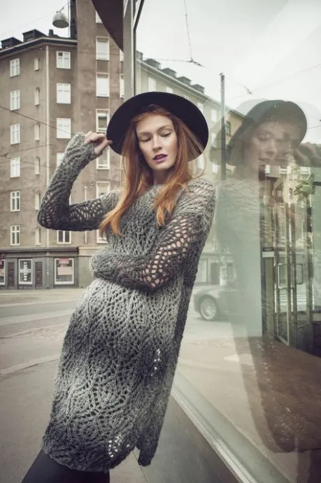 Перед: на спицы наберите 63(75) п., провяжите 1-й изн. ряд изн. петлями. Далее вяжите ажурным узором, начиная с 1-го ряда, следующим образом: провяжите 7 п. перед раппортом, затем провяжите 12 п. раппорта 4(5) раз, в конце провяжите 8 п. после раппорта. Повторяйте 1 - 24-й ряды. На высоте работы 78(82) см закройте все петли как лиц. на изн. стороне.