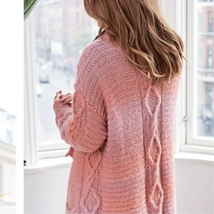 Пряжа Langyarns Carina (63% шерсти альпака, 37% нейлона; 50 г/150 м) — 11 (13) мотков розовой меланжевой (цвет 1028.0009); прямые спицы № 5 и 5,5; круговые спицы № 5 длиной 80−100 см; маркеры для петель; вспомогательные спицы.