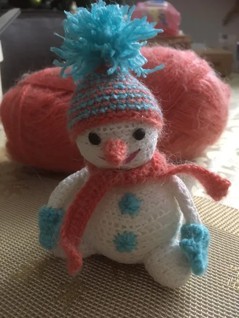 Из остатков пряжи получился забавный снеговик. Связан крючком