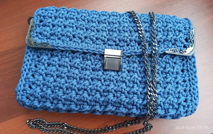 Моя хорошая знакомая возжелала иметь вязаную сумочку, чтобы подходила к джинсам, на повседневку, небольшой вместимости. А у меня был шнур цвета джинс, из которого я собиралась связать что нибудь себе. Но мне не жалко, я связала ей сумочку, украсила фурнитурой, сделала подклад. Передняя и задняя часть сумочки укреплена пластиком,и поэтому она отлично держит форму. Сегодня новая хозяйка сумочки увидела ее впервые (я редко показываю готовое изделие, чтобы был эффект сюрприза). Прыгала от радости, как ребенок. Бывает же такое!