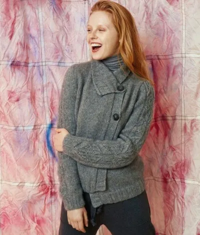 Пряжа Langyarns Cashmere Light (88% кашемира, 12% полиамида; 85 м/ 25 г) — 16 (18) 20 (22) мотков светло-серой (№ 950.0003); спицы № 6 и 7; вспомогательная спица № 7; крючок № 5,5; длинные круговые спицы № 6; 2 пуговицы.