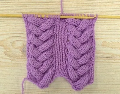1-й ряд (ЛС): 10 лицевых, [повернуть, 4 изн, повернуть, 4 лиц] 3 раза, снять эти 4 петли на вспомогательную спицу и оставить перед работой, перевести нить назад, перенести 4 петли с правой спицы на левую, 10 лиц.