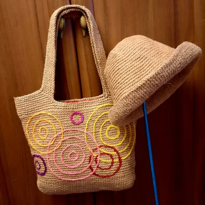 Сумка и шляпа из джутовой пряжи. Шляпка хороша для прохладной погоды. После стирки на режиме " шерсть" изделия стали мягкими, как я и хотела... Но сели на 2 см. Шляпку пришлось довязывать. Сумку вышивала после стирки...