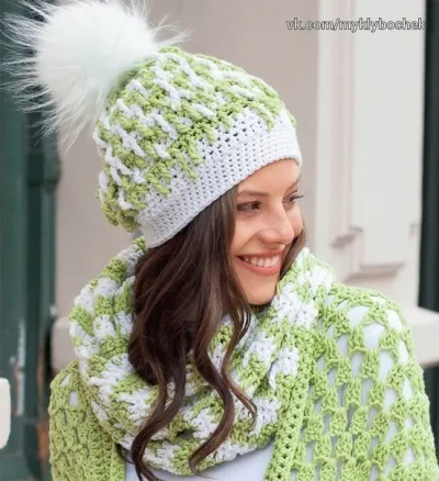 Двухцветный комплект из шапки с помпоном и снуда, связанный крючком рельефным узором, очень практичный и удобный и отлично спасает от холода.