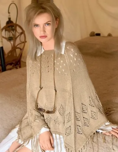 Красивое пончо, украшенное ажурными узорами, связано от горла единым полотном.