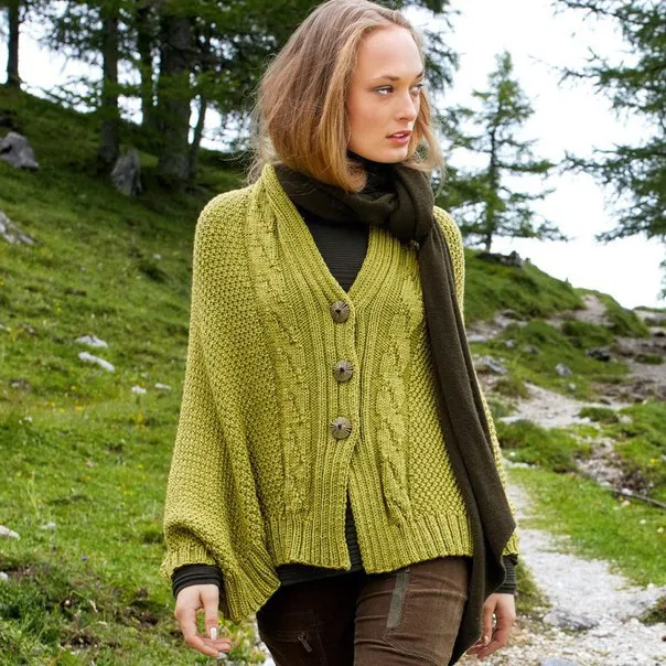 Вязать на большом количестве петель рядами в прямом и обратном направлениях удобнее на круговых спицах. Изделие вяжется в поперечном направлении от левой полочки. Стрелкой на выкройке обозначено направление вязания.