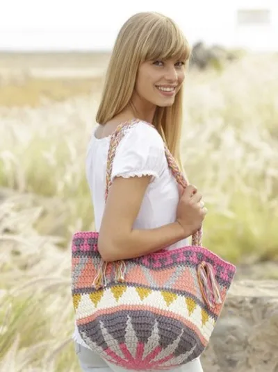 Отрезать по 6 нитей каждого цвета длиной 120 см = 36 нитей. Соединить нити и завязать в тугой узел, оставляя свободными приблизительно 12 см. Распределить нити на 3 группы по 12 нитей в каждом. Заплести из косу длиной приблизительно 68 см. Разделить концы на две части. Протянуть их между ст. с н. (1 ст. с н. посередине) в третьем ряду от края сумки. Связать их в узел с лицевой стороны сумки. Развязать узел в начале «косы» и привяжите его таким же образом с другой стороны сумки. Сделать еще одну ручку и прикрепить ее точно так же – см. фото.