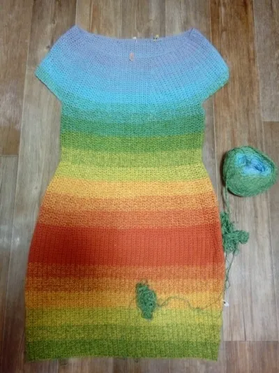 Три года точно лежит в недовязах. Цвет брала к босоножкам, их уже износила. Платье хотела приталенное и футляр, но за три года я и вес набрала. Вот теперь не знаю , что и делать. Что посоветуете? может распустить и летний кардиган?