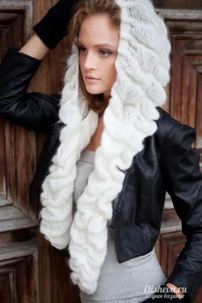 Сначала выполняем узор «драпировкой» по горизонтали. Следует отметить, что длина шарфа-шапочки составляет 272 см, а ширина, соответственно – 32 см. Данное изделие вяжется нитью в три сложения. Для этого набираем 41 петлю вспомогательной нитью спицами №2,5 и выполняем восемь рядов основной нитью чулочной гладью.