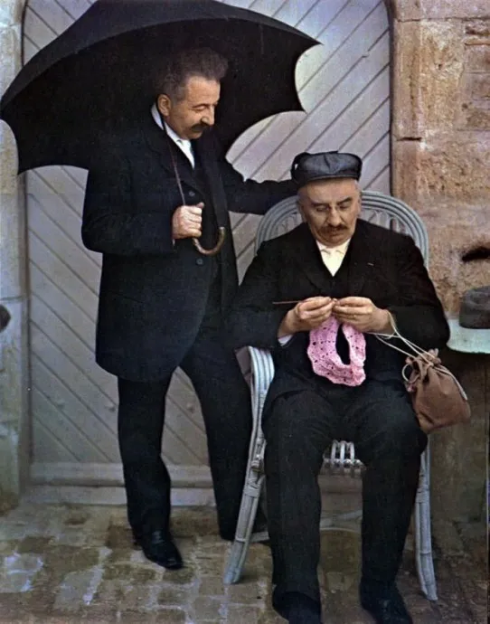 На снимке великие Огюст Люмьер и Луи Люмьер позируют для своей первой цветной фотографии в 1907 году в Лионе. Те самые братья Люмьеры, которые создали и открыли для нас мир кино. Оказывается, Огюст всю жизнь увлекался вязанием.