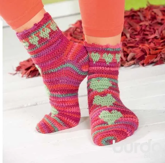 За нитяное кольцо из розовой пряжи выполнить 8 полустолбиков и согласно учебному курсу количество петель для мыска увеличить до 44 (44) 48 п. Далее вязать основным узором и на средних 11 п. верхней части стопы вывязать по схеме мотив «Большое сердце». * Закончив схему, выполнить 2 круговых ряда розовой нитью и еще один мотив «Большое сердце». От * повторить еще 1 раз.