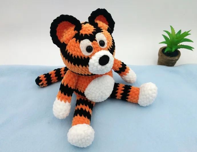 Плюшевый тигр с рыбкой связан из плюшевой пряжи по бесплатной схеме от IRINELY.ART